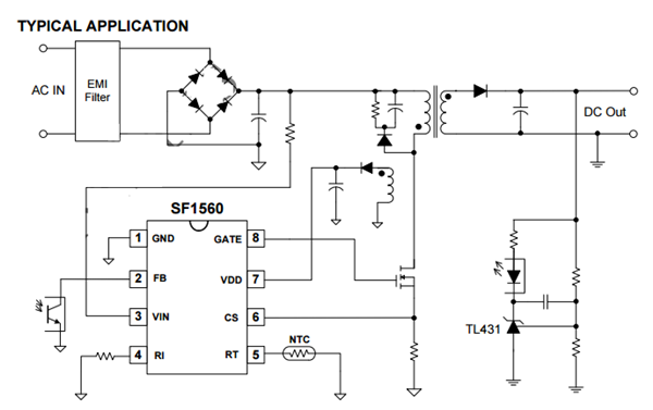 該系列集成了諸多保護功能,比如:VDD欠壓保護(UVLO),VDD過壓保護,軟啟動,逐周期過流保護,管腳浮空保護,GATE輸出電壓鉗位保護,VDD電壓鉗位保護,等等。SF1560提供SOP8封裝。