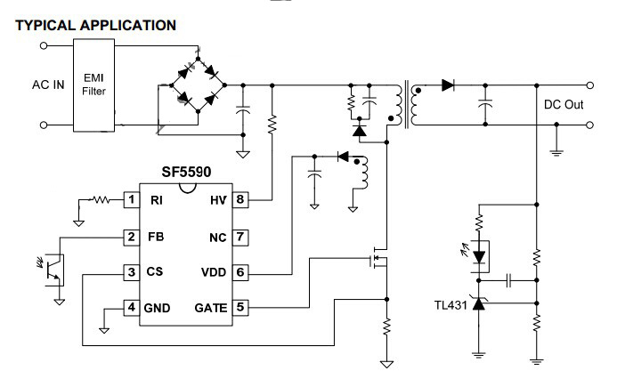 SF5590是一款高性能,高效率,高集成的電流模式PWM控制器,適用于大中型離線反激式轉(zhuǎn)換器應(yīng)用。PWM開(kāi)關(guān)頻率與洗牌固定為65KHz的,并修剪成窄幅波動(dòng)。當(dāng)輸出功率要求降低,IC自動(dòng)基于專有η - BalanceTM控制,以提高電源轉(zhuǎn)換效率在輕負(fù)載減小開(kāi)關(guān)頻率。 SF5590還集成了專有的HV- MWTM技術(shù),實(shí)現(xiàn)小于50mW的待機(jī)功耗。