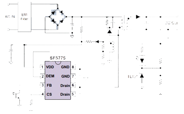 SF5775是多模式控制器。當(dāng)滿負荷,該IC在CCM模式或QR模式的基礎(chǔ)上AC線路輸入的工作。當(dāng)負載變低時,IC進入“數(shù)字頻率折返”的模式,以提高功率轉(zhuǎn)換效率。當(dāng)輸出功率是非常小的,IC進入到突發(fā)模式,可以實現(xiàn)小于100mW的空載功率。