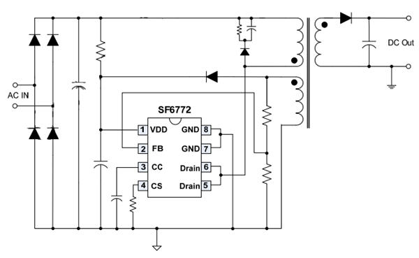 SF6772是準(zhǔn)諧振(QR)模式的高精度原邊反饋控制(PSR)恒壓恒流(CV/CC)控制器。該系列驅(qū)動外部功率MOS管,非常適合低成本小功率充電器、適配器、和       LED照明場合。