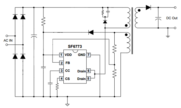 SF6773集成功能和保護(hù)的FB短保護(hù)欠壓鎖定(UVLO)VDD過壓保護(hù)(VDD OVP)、輸出過壓保護(hù)(OVP輸出)軟啟動逐周期限流((OCP)針浮保護(hù)提供SOP7封裝!