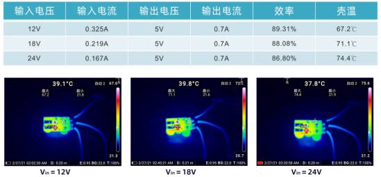 溫升測(cè)試:測(cè)試條件:Vin=12/18/24V, Vout=5V/0.7A, 環(huán)境溫度25℃,Demo半開放、無風(fēng)環(huán)境;