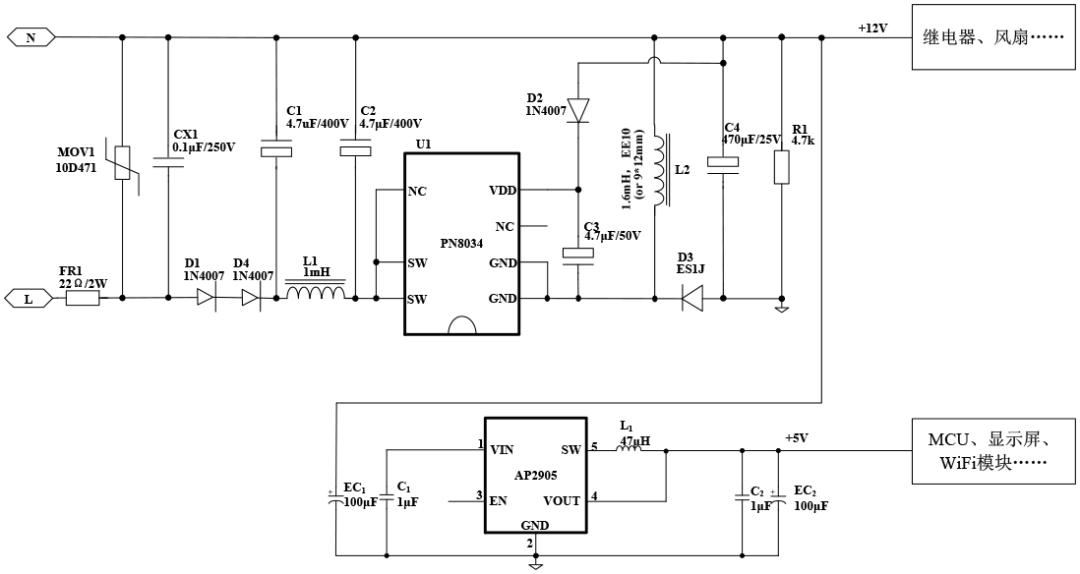 在家電應(yīng)用中,市電通過非隔離開關(guān)電源PN8034轉(zhuǎn)化為直流12V輸出給繼電器、風(fēng)扇等負(fù)載,同時(shí)由AP2905將12V降壓到5V作為MCU、顯示屏、WiFi模塊供電。
