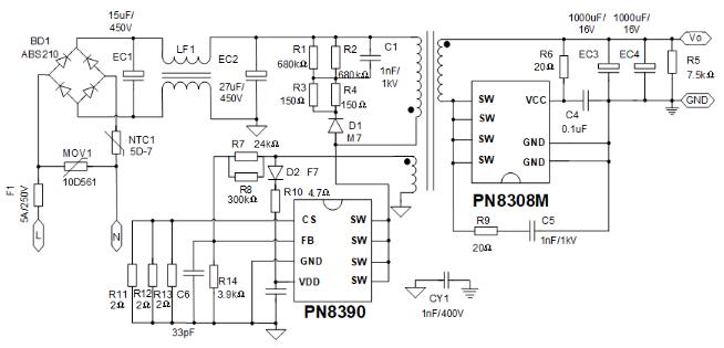 基于PN8390+PN8308M高集成度原邊反饋12V2A六級(jí)能效方案,支持CCM/QR/DCM任意工作模式,進(jìn)一步提升電源效率并顯著減小變壓器體積,動(dòng)態(tài)和EMC性能卓越,保護(hù)功能強(qiáng)大,目前大批量產(chǎn)于機(jī)頂盒、路由器、智能音響、家用電器等應(yīng)用場(chǎng)合。