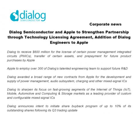 Dialog是一家總部位于英國的芯片制造商,自從第一款iPhone問世以來,就一直與蘋果合作,根據(jù)協(xié)議,蘋果除了需要支付3億美元的前期收購(包括300名研發(fā)工程師和英國、意大利及德國等地區(qū)辦公室在內(nèi)的Dialog部分資產(chǎn))資金之外,同時需要預(yù)付3億美元作為后續(xù)采購Dialog產(chǎn)品的預(yù)付款,包括電源管理、音頻子系統(tǒng)、充電和其他混合信號IC的開發(fā)和供應(yīng)。