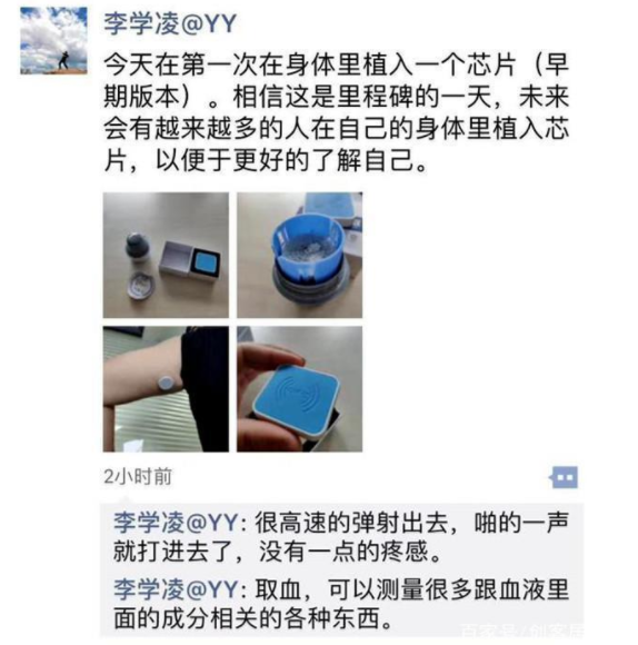 國(guó)內(nèi)知名直播平臺(tái)納斯達(dá)克上市公司YY創(chuàng)始人李學(xué)凌,近日在其朋友圈分享的在手臂上植入芯片的消息,引起了廣泛關(guān)注,這其實(shí)是一個(gè)健康檢測(cè)的芯片,李學(xué)凌表示“相信這是里程碑的一天,未來(lái)會(huì)有越來(lái)越多的人在自己的身體里植入芯片,以便于更好的了解自己。”
