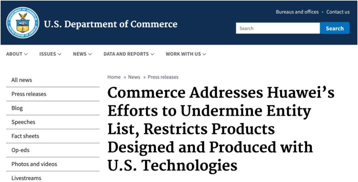 5月15日,美國(guó)商務(wù)部工業(yè)與安全局(BIS)官方宣布,將嚴(yán)格限制華為使用美國(guó)的技術(shù)、軟件設(shè)計(jì)和制造半導(dǎo)體芯片進(jìn)而保護(hù)美國(guó)國(guó)家安全。9月15日美國(guó)禁令升級(jí),多家半導(dǎo)體公司停止向華為供應(yīng)芯片,華為的全球芯片供應(yīng)鏈就被徹底切斷。