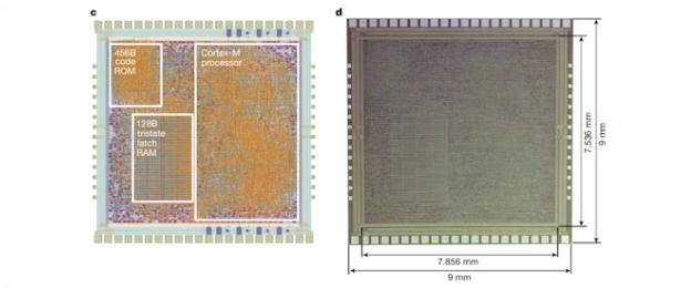 PlasticARM是32位的芯片,采用0.8μm的工藝,由56340個NMOS晶體管和電阻器組成,面積為59.2mm2,時鐘頻率最高可達29KHz,功耗僅為21mW,該處理器完全支持 Armv6-M 指令集架構(gòu)。