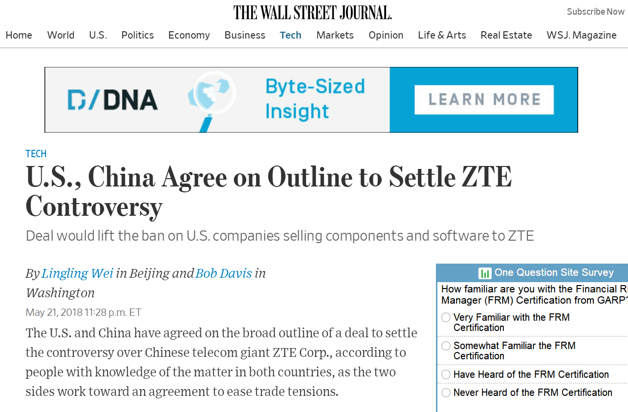 5月22日,華爾街日?qǐng)?bào)援引消息人士稱,中美就解決中興通訊公司問題的大致路徑達(dá)成一致,美國將取消中興通訊銷售禁令,華盛頓作出的七年內(nèi)禁止向中國通信巨頭中興出口美國制造的重要元件的“懲罰”似乎無法兌現(xiàn)了。