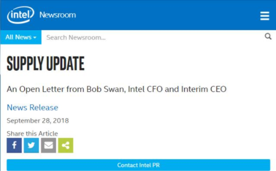同時英特爾也發(fā)出了如下聲明:“今年以來,客戶需求持續(xù)改善,推動了英特爾各個業(yè)務(wù)部門的增長。較今年1月份的預期,英特爾將2018年營收預期上調(diào)了45億美元。我們將給予供應,以實現(xiàn)我們公布的全年收入預期。我們正與客戶和工廠密切合作,以滿足出現(xiàn)的任何需求增長。