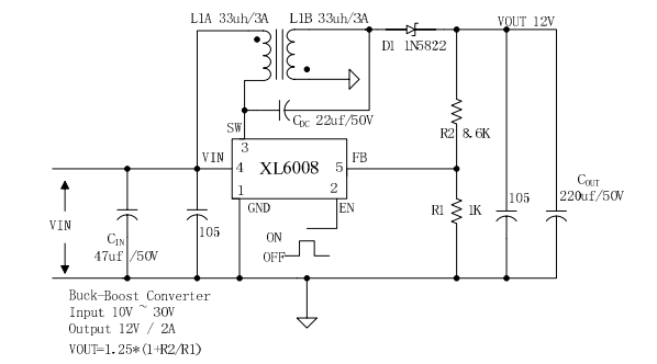 如果要求輸出電流在3A以內(nèi),那么可以用xl6008,這款寬輸入范圍,電流模式,能夠產(chǎn)生或正或負的輸出電壓的DC / DC轉(zhuǎn)換器,它的輸入電壓范圍是5V~32V,輸出電壓調(diào)節(jié)范圍是60V。12V輸出的實用電路如圖1.