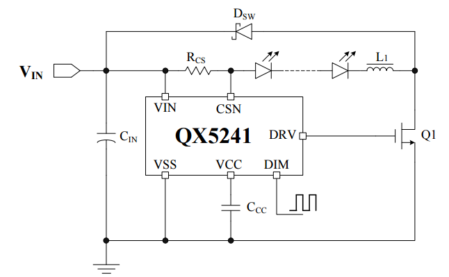 QX5241是通過(guò)外接一個(gè)電阻設(shè)定輸出電流,最大可達(dá)3A,通過(guò)DIM引腳實(shí)現(xiàn)輝度控制功能。并采用泉芯特有的專(zhuān)利結(jié)構(gòu),在寬輸入電壓范圍下,保證電流檢測(cè)達(dá)到±5%的電流精度,由于采用滯環(huán)控制方式,QX5241對(duì)負(fù)載瞬變具有非?斓捻憫(yīng)速度,對(duì)輸入電壓具有高的抑制比,最高工作頻率可到2MHz,工作溫度范圍從-40℃到125℃.