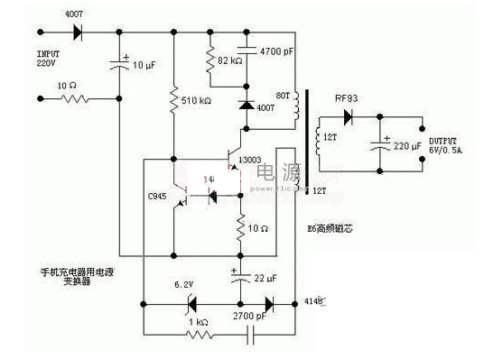 而下方的1KΩ電阻跟串聯(lián)的2700pF電容,則是正反饋支路,從取樣繞組中取出感應(yīng)電壓,加到開關(guān)管的基極上,以維持振蕩。右邊的次級繞組就沒有太多好說的了,經(jīng)二極管RF93整流,220uF電容濾波后輸出6V的電壓。沒找到二極管RF93的資料,估計是一個快速回復(fù)管,例如肖特基二極管等,因為開關(guān)電源的工作頻率較高,所以需要工作頻率的二極管。這里可以用常見1N5816、1N5817等肖特基二極管代替。